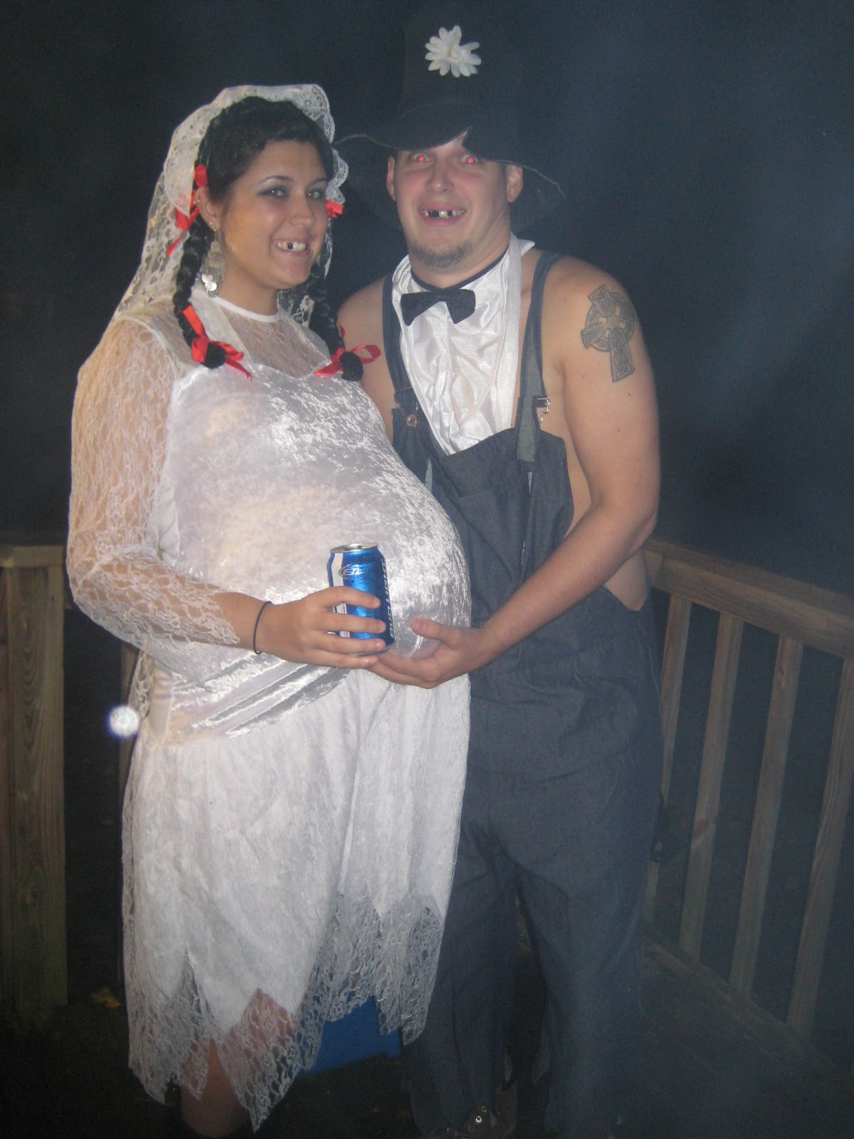 we were a Shotgun Wedding, complete with pregnant belly, pigtails, & wedding dress for me and blacked out teeth & top hat for him. it was a huge hit at the party we went to! I made sure to drink plenty of beer and smoke lots of cigarettes, since I heard it was good for babies growth.